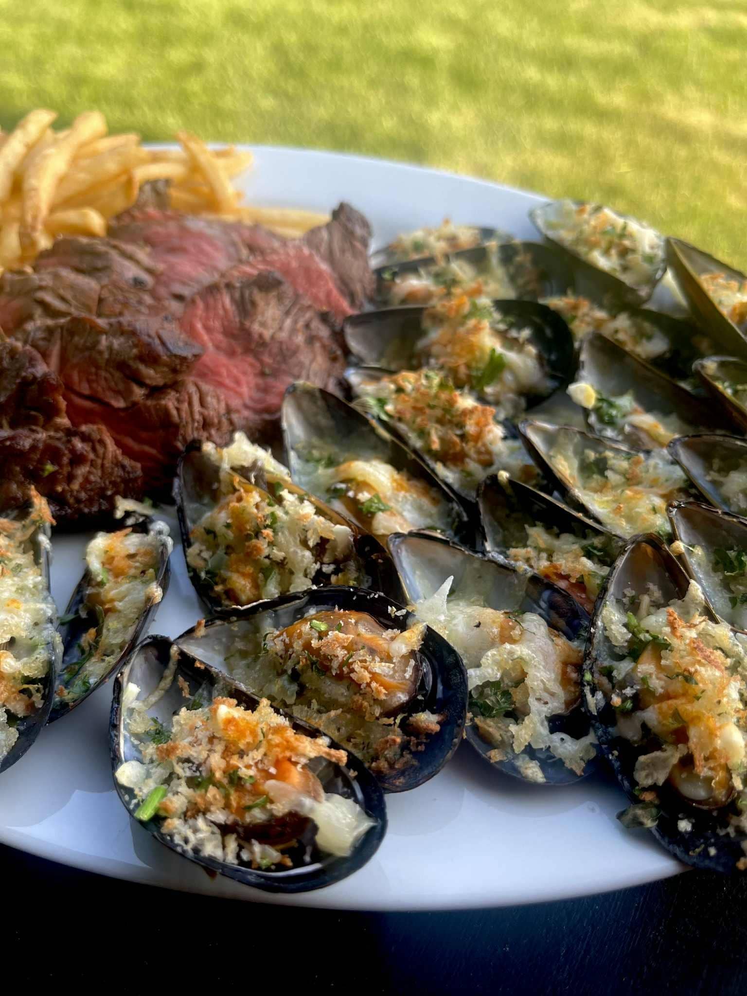 Une fois les moules ouvertes, retirer du feu et séparer les coquilles. Conserver le côté de la coquille qui contient la moule et les déposer sur une plaque de cuisson recouverte de papier parchemin.